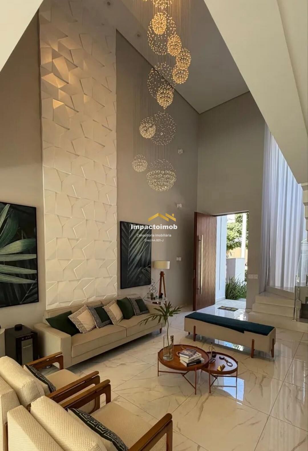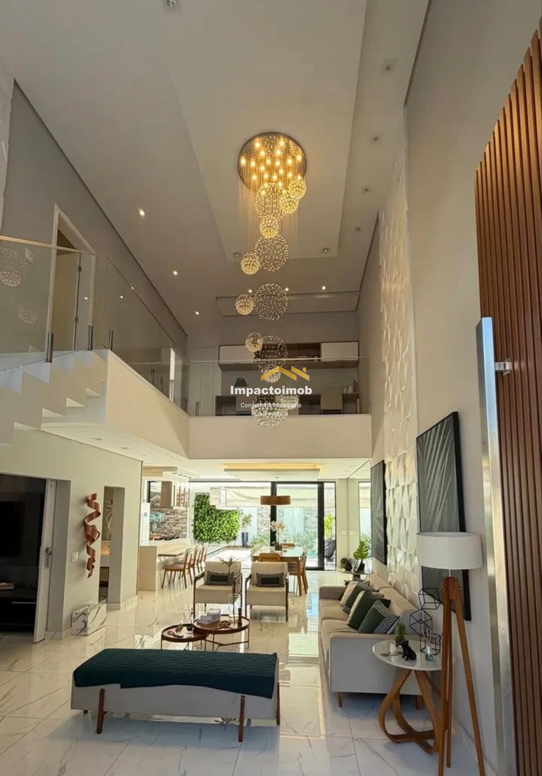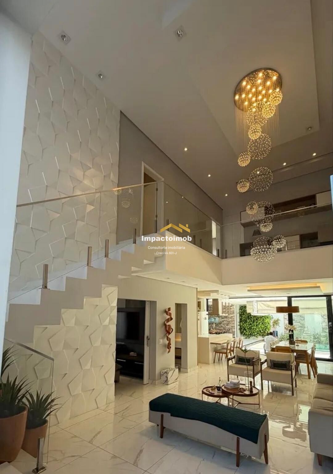- Sala pé direito duplo com lustre em cristal e escada em pedra e vidro com lavabo, mais 1 banheiro onde atende a piscina
